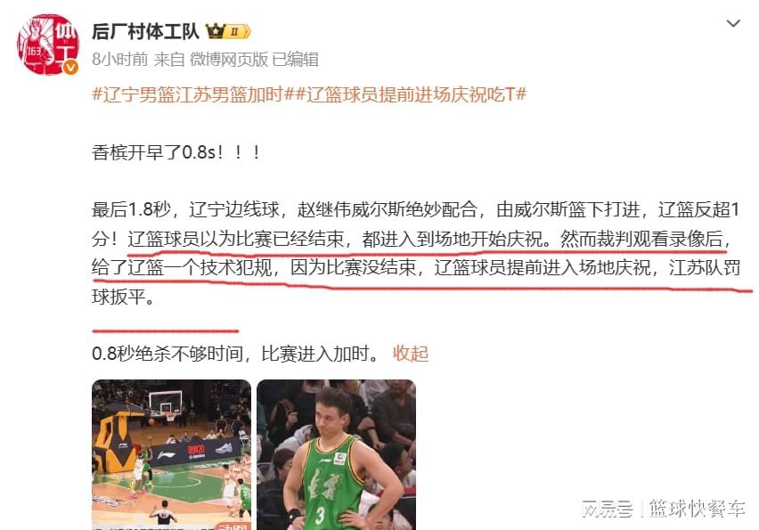 尽管在随后的加时赛,辽宁队再也没有给江苏队任何机会,他们轰出一波15-2的攻击波,最终以95-82大胜江苏队。不过,他们这一次提前开香槟的庆祝动作,却险些毁了全场的努力。要知道,在技术犯规后,江苏队还剩下0.8秒,如果他们上演绝杀的话,那么,辽宁队替补席这一提前庆祝动作,将会成为CBA历史上最大的笑话。不过,好在他们在加时赛足够争气,避免成为人们茶余饭后的笑话。